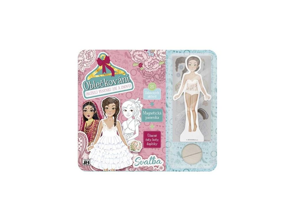 Set obsahuje 25 stránek plných módních aktivit i omalovánek, magnetickou panenku a spoustu magnetických částí (šaty, boty, doplňky) s motivem svatby.Doplňkové parametry