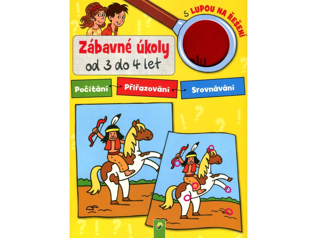 Zábavné úkoly od 3 do 4 let - počítání, přiřazování, srovnávání. Takhle se učení stává zábavou! Pestře ilustrované úkoly pro děvčata i chlapce ve věku od 3 do 4 let: poznávání rozdílů a hledání společných znaků, určování pořadí, veselé příklady a spousta jiných úloh. Zábavné úkoly: podporují logické myšlení, procvičují schopnost soustředit se, rozvíjejí pozornost a vnímavost. Podařilo se ti vyřešit úkol? Zkontroluj si správnost odpovědi! Lupu s barevným filtrem polož na červenou plochu a pak uvidíš správné řešení. Doporučená věková kategorie je od 3 let. Upozornění! Nevhodné pro děti do 3 let. Nebezpečí udušení malými částmi, které mohou děti polknout.Doplňkové parametry